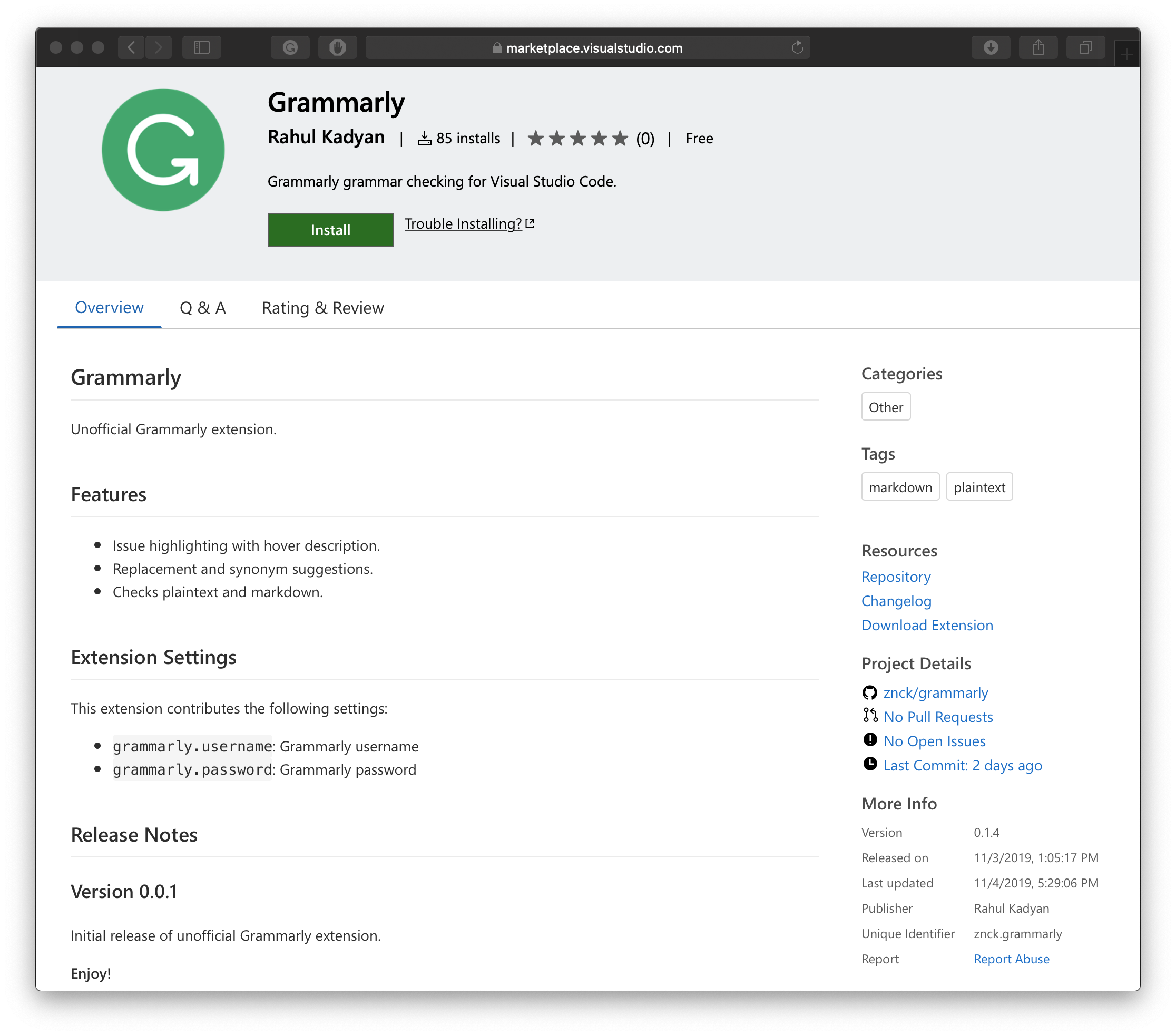 I searched the code marketplace for a Grammarly extension, but there wasn't one. So, I continued jumping between Grammarly and Code, waiting for someone to remedy my pain. A year passed, but nobody came up with a solution. I couldn't bear it anymore; I had to help me; I had to build the integration myself. And, the journey of getting Grammarly in Code began.