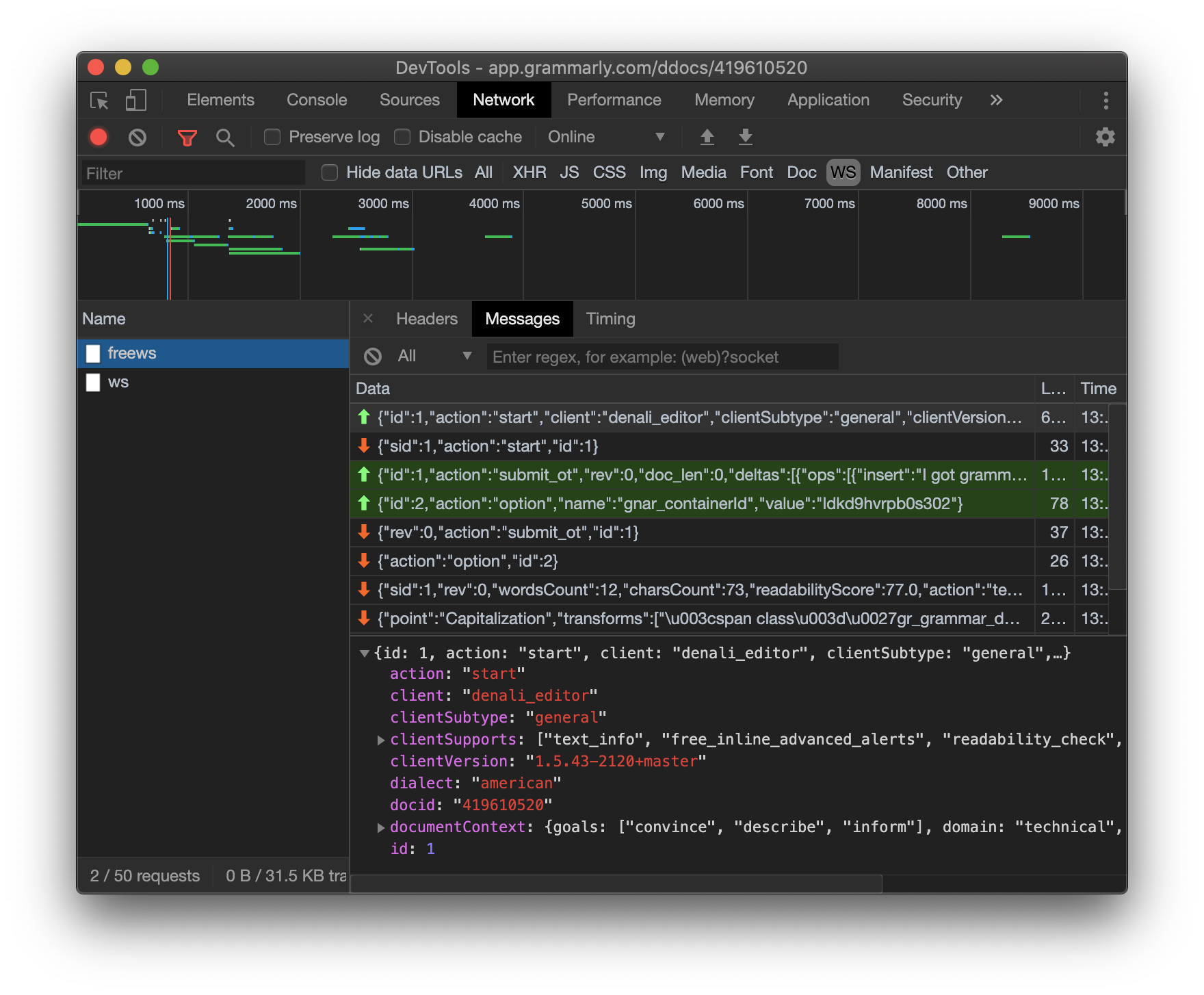 On further inspection of messages, I found every message has a fixed structure: a message id, action, and the payload required for the action. The id value is from a sequence starting from 0 and incremented on every subsequent message. I guess, the action is the name of the function executed on the server, it looks like an RPC API. For every message sent, the server returned a response with the same id as the message. I needed more data to understand the API, so I started fiddling with the Grammarly editor while monitoring the socket connection.