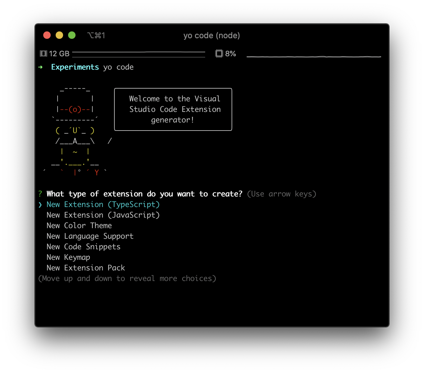 I wanted to validate the idea with minimum efforts, so I looked for a project scaffold to kickstart the extension. VS Code has yeoman generator. Hence, all I needed was to run the command yo code.